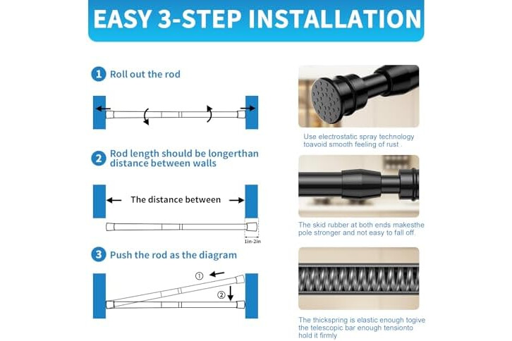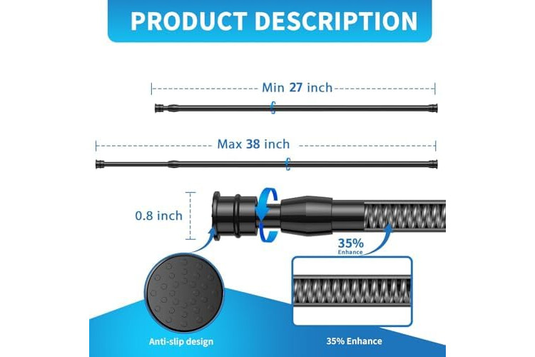 【Many Application Scenarios】 The length of curtain rod/shower curtain stall rod can extend from 27 to 38 inches, Easy to use, It can be used as curtain rod,shower curtain rod, clothes rod, room divider, thick fabric, etc. Easy to install; Just twist one end to adjust the length.