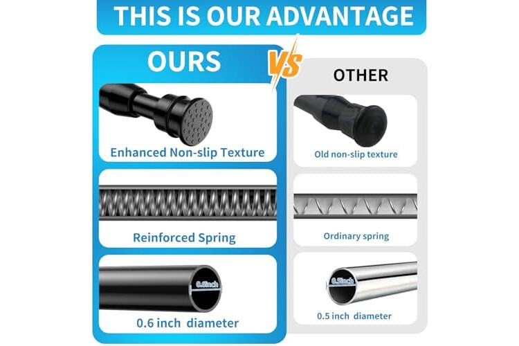 【Quality materials 】The Upgrade Spring Tension Rod is made from metal and non slip plastic rubber ends.