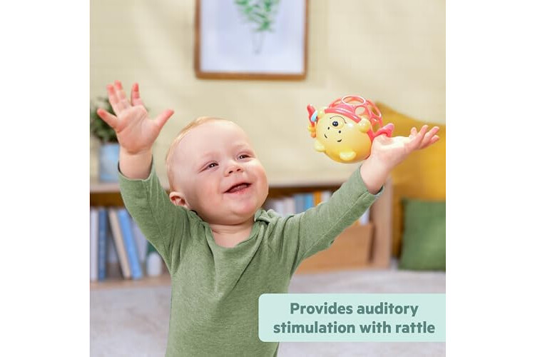 Grasp the flexible Oball for fine motor skill development, shake the jingle ball to engage auditory senses, and spin the colorful beads for tactile stimulation