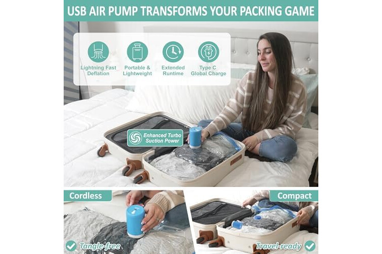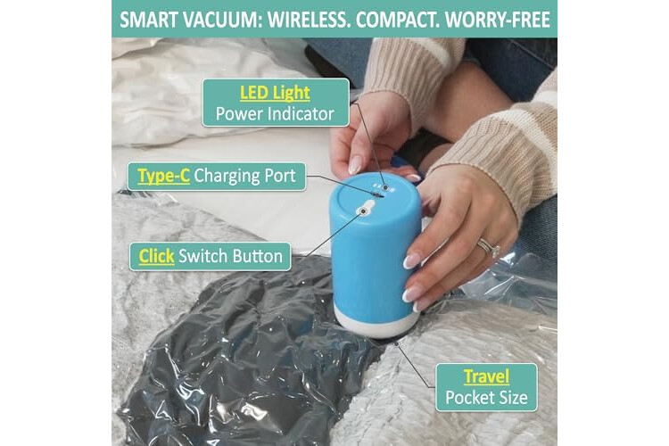 Rechargeable Wireless Air Pump for Fast & Powerful Compression: Our game-changing rechargeable air pump delivers strong suction that removes air from clothes, sweaters, even coats and quilts in just 10–30 seconds. Compact and portable, travel-friendly design that fits your suitcases, backpacks, and carry-ons. USB charging with Type-C plug via laptop or power bank ensures worldwide compatibility, and compresses up to 90 bags per charge.