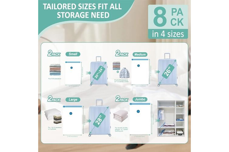 Tailored sizes to fit your travel & storage needs:This 8-piece all-in-one set includes multiple bag sizes from carry-on packing and checked luggage to seasonal home storage-Includes 2 Small(23.5inx15.7in) for 20"-24" luggage or 40L above backpack, 2 Medium(27.5inx19.5in) for 26" luggage, 2 Large(33.5inx21.65in) for 28" lug...
