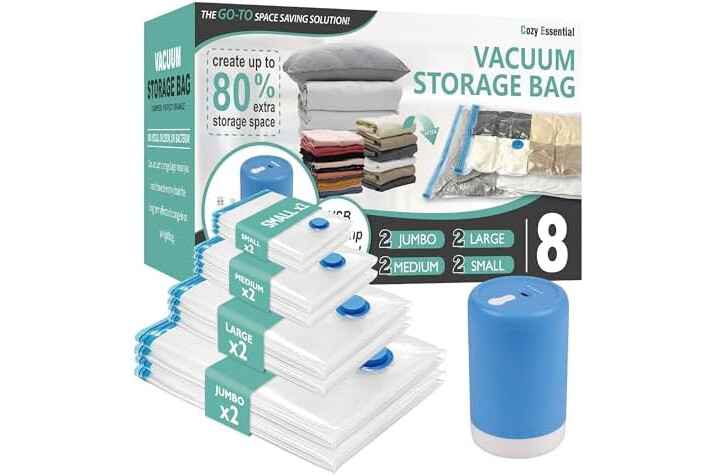 Cozy Essential Travel Vacuum Storage Bags with Rechargeable Cordless USB Pump, Space Saver Bags for Luggage, Suitcase, Carry-On, for Clothes, Blankets, Bedding & Seasonal Storage,8 Combo
