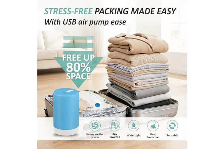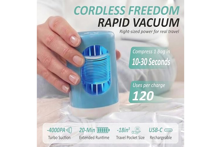Rechargeable Cordless Air Pump for Fast & Powerful Compression: Our game-changing rechargeable air pump delivers strong suction that removes air from clothes, sweaters, even coats and quilts in just 10–30 seconds. Compact and portable, travel-friendly design that fits your suitcases, backpacks, and carry-ons. USB charging with Type-C plug via laptop or power bank ensures worldwide compatibility.