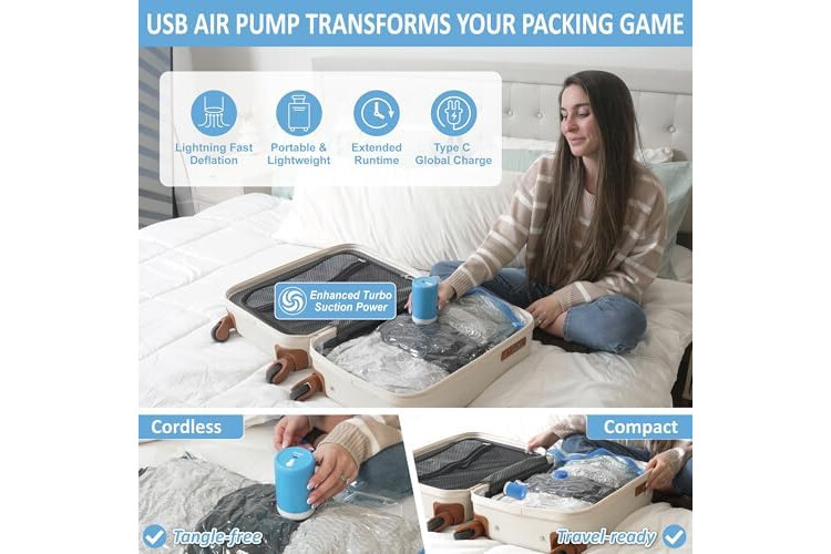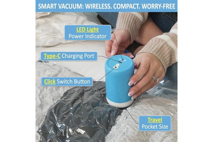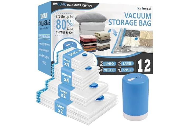 Cozy Essential 12 Pack Travel Vacuum Storage Bags with Rechargeable Wireless Electric Pump for Luggage, Suitcase, Carry-on Size Vacuum Seal Compression Space Saver Bags for Clothes and Clothing Travel