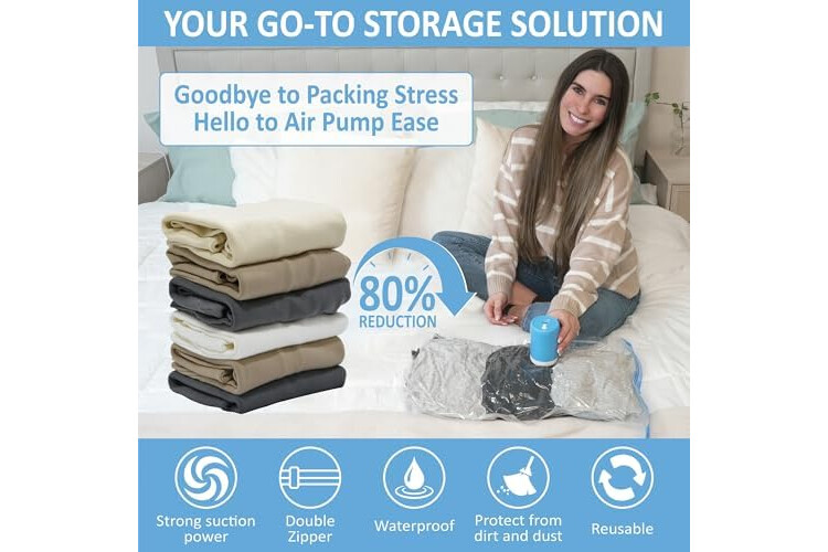 Unlock your storage capacity with our rechargeable & cordless electric air pump vacuum storage bags: cozy essential space saver bags increase your storage space by up to 80%. Utilize the electric pump to effortlessly compress clothes, duvets, pillows, bedding, and more into your wardrobe, suitcase, or underbed storage in seconds, guarding your items and keeping an organized space.