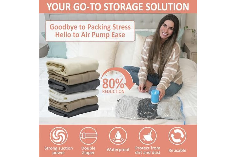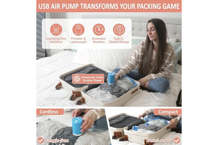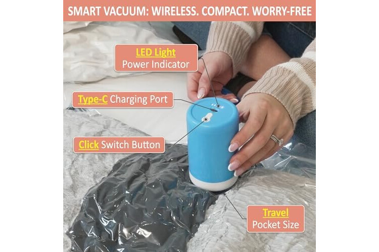 Unlock your storage by up to 80%: Our rechargeable, cordless electric air pump vacuum bags effortlessly compress clothes, blankets, pillows, and travel essentials in seconds, keeping your items protected, organized, and travel-ready—no extra luggage fees, no clutter, just more space.