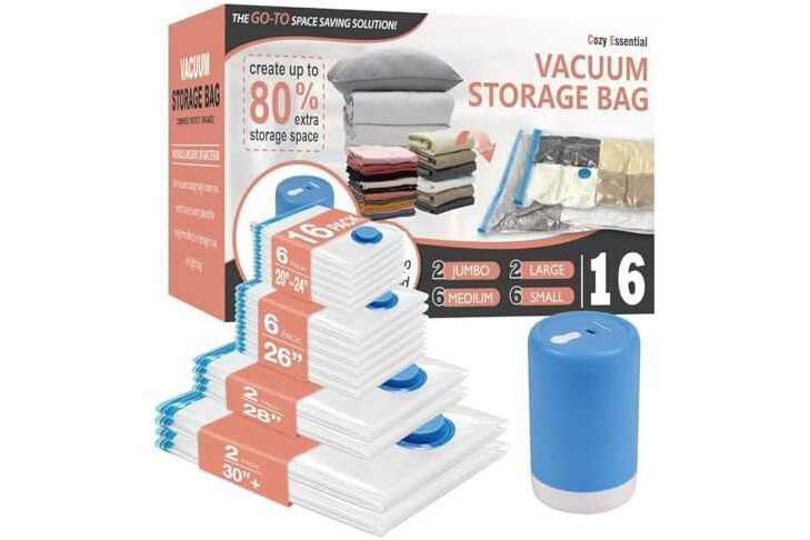Cozy Essential 16 Pack Travel Vacuum Storage Bags with Rechargeable Wireless Electric Pump for Luggage, Suitcase, Carry-on Size Vacuum Seal Compression Space Saver Bags for Clothes and Clothing Travel