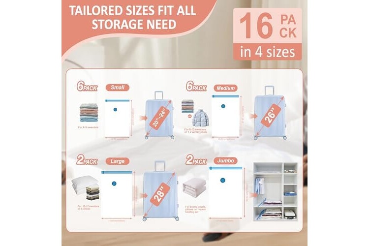 Tailored sizes for travel & storage needs: Cozy Essential 16 combo includes 6 Small(23.5inx15.7in) for 20"-24" luggage or 40L above backpack, 6 Medium(27.5inx19.5in) for up to 26" luggage, 2 Large(33.5inx21.65in) for up to 28" luggage, 2 Jumbo(39.35in X 27.5in) for up to 30" above luggage and 1 electric air pump for effortless, versatile packing.