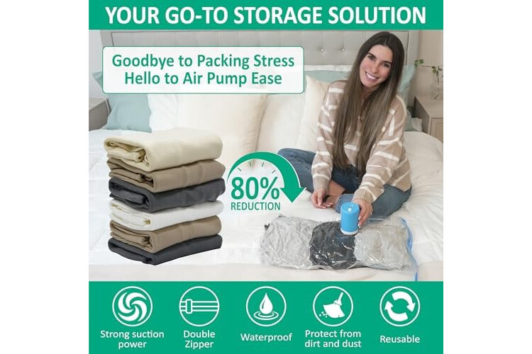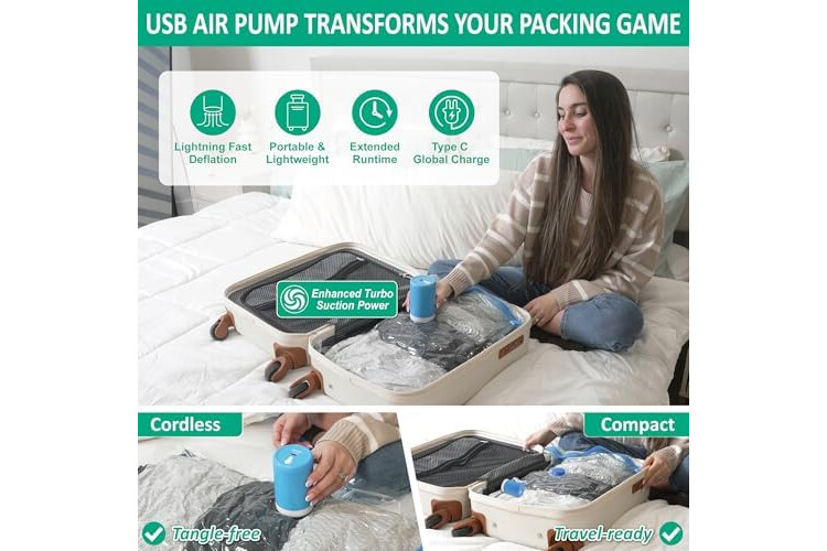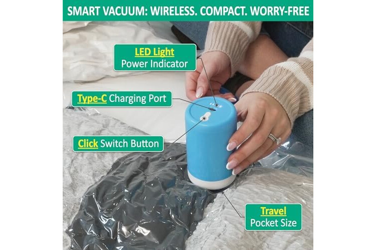 Unlock your storage by up to 80%: Our rechargeable, cordless electric air pump vacuum bags effortlessly compress clothes, blankets, pillows, and travel essentials in seconds, keeping your items protected, organized, and travel-ready—no extra luggage fees, no clutter, just more space.