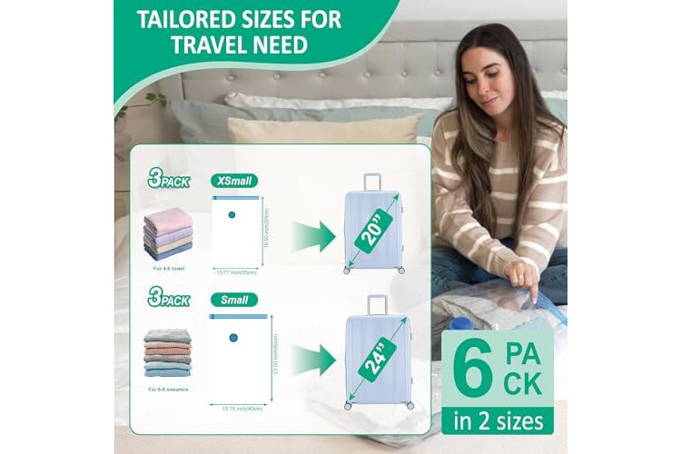 Tailored sizes for travel & storage needs: Cozy Essential 6 combo includes 3 xSmall (13.77inx19.50in) for 20" luggage or 20-30L backpack and 3 Small(23.5inx15.7in) for up to 24" luggage or 40L above backpack, 1 electric air pump for effortless, versatile packing.
