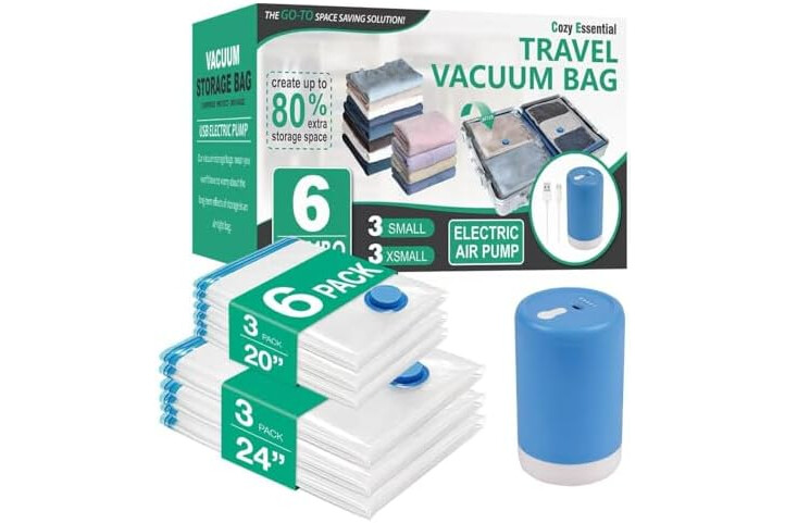 Cozy Essential 6 Pack Travel Vacuum Storage Bags with Rechargeable Wireless Electric Pump for Luggage, Suitcase, Carry-on Size Vacuum Seal Compression Space Saver Bags for Clothes and Clothing Travel