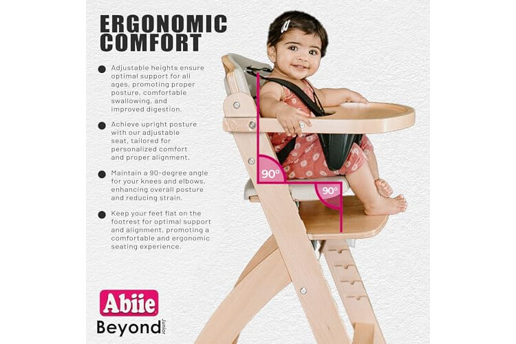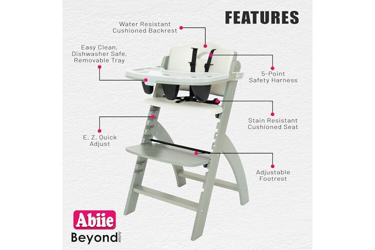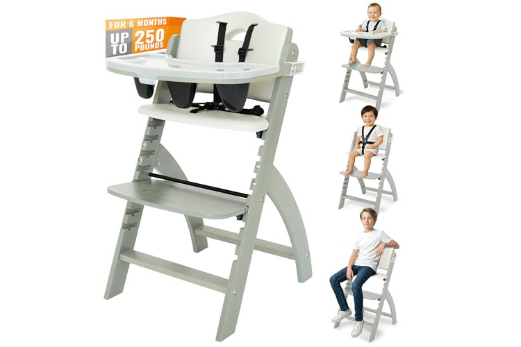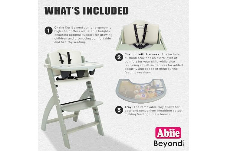 Abiie Beyond Junior Wooden High Chair with Tray - Adjustable and Convertible High Chair for Babies and Toddlers - 6 Months to 250 Lb - Water Resistant - Misty Grey Wood/Dove Grey Cushion