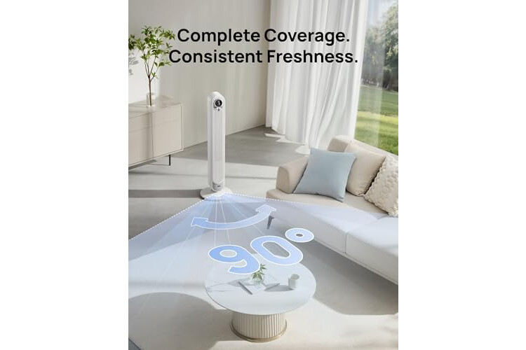 24ft/s Velocity: This tower fan is equipped with a powerful motor and a unique air-duct that can provide a velocity of 24ft/s, effectively distributing airflow around the room. It lets you enjoy the cool quickly