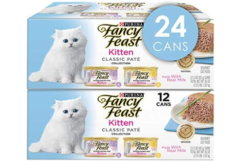 • Two (2) Packs of Twelve (12) 3 oz. Cans - Purina Fancy Feast Grain Free Pate Wet Kitten Food Variety Pack, Kitten Classic Pate Collection Chicken & Salmon
