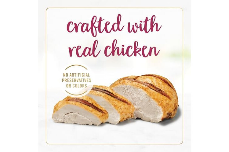 • Purina Fancy Feast senior wet cat food featuring real chicken and made without artificial colors or preservatives