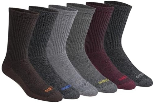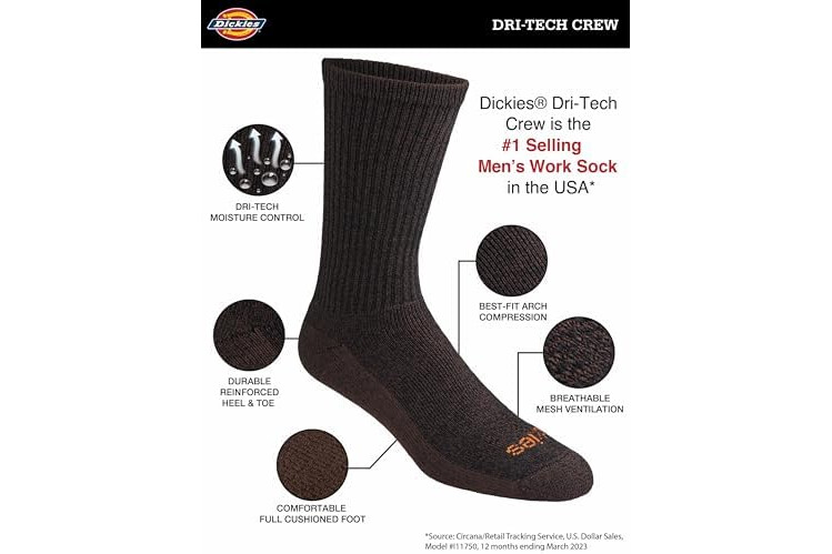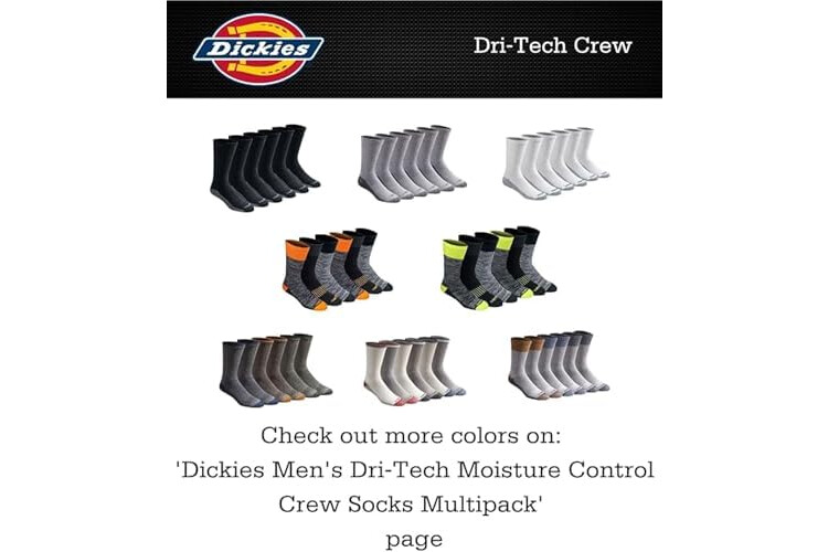 Dickies dri-tech comfort 6 Pairs crew with wicking, moisture management fibers keeps feet dry, ventilation channels engineered for air circulation and moisture control, arch compression hugs feet and keeps socks in place, while providing in-step support, Reciprocated heel and toe for superior fit and full cushion comfort