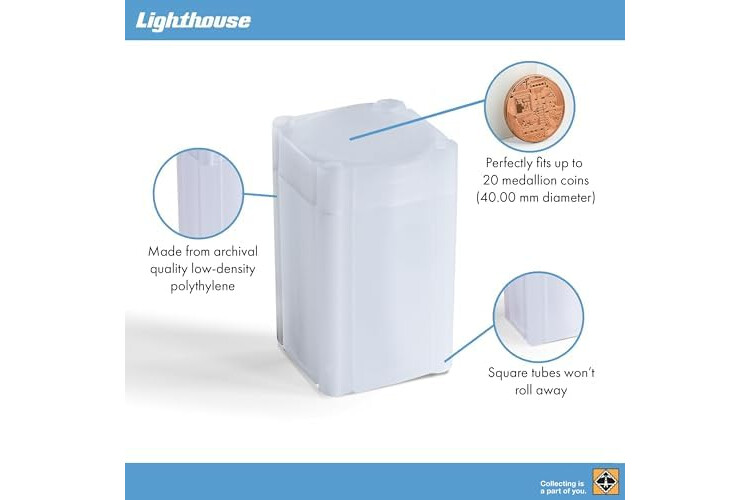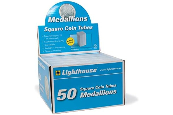 LIGHTHOUSE square coin tubes for MEDALLIONS (1oz copper and silver rounds) are the industry standard for over 50 years and can each store up to 20 coins.