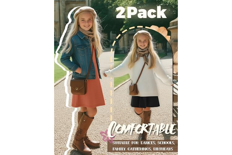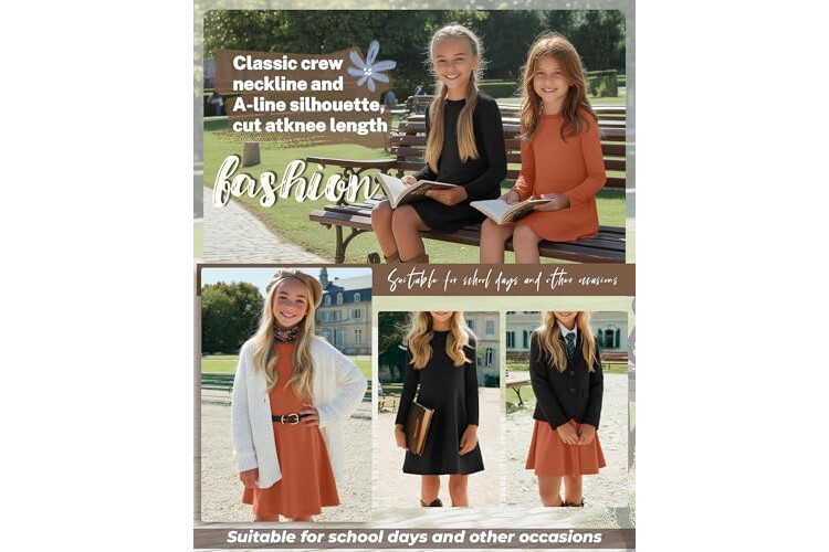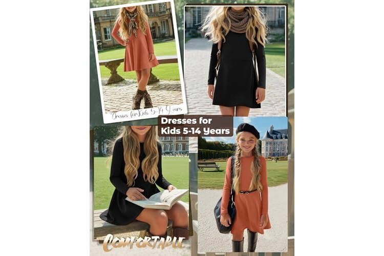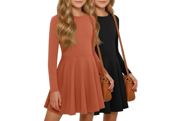 2 Pack Girls Long Sleeve Dress Skater Twirl a Line Crewneck Casual Fall Dresses for Kids 5-14 Years