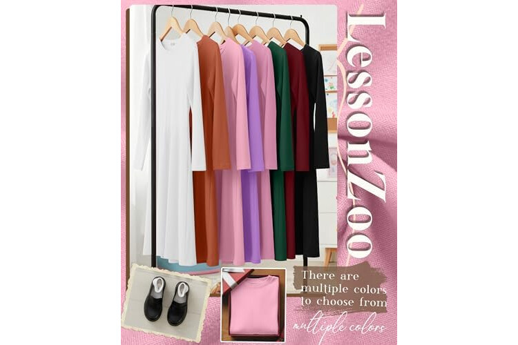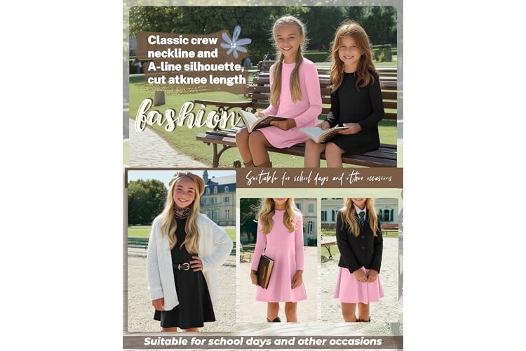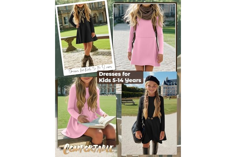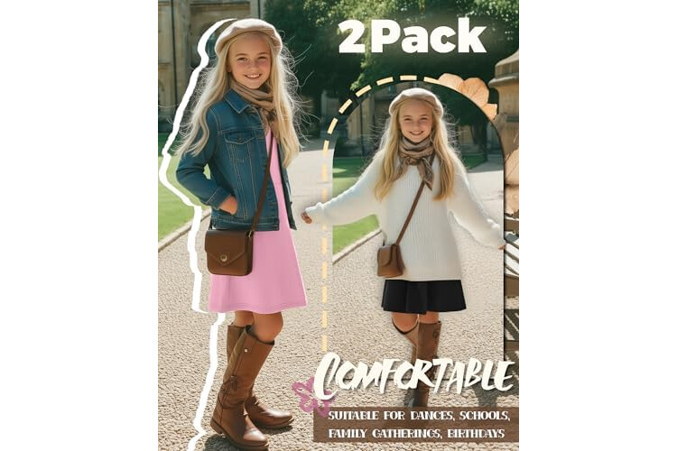 2 Pack Girls Long Sleeve Dress Skater Twirl a Line Crewneck Casual Fall Dresses for Kids 5-14 Years