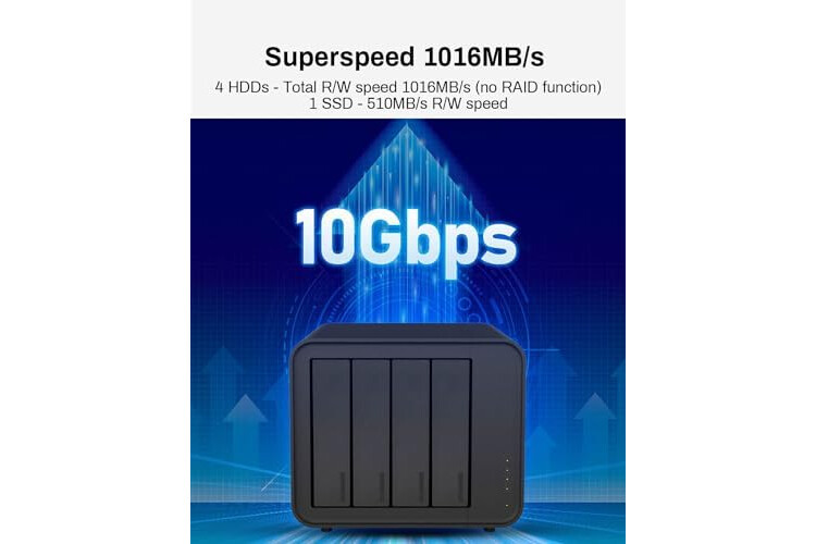 High-Speed Data Transmission: The D4-320 hard drive enclosure (a DAS, NOT a NAS) utilizes the USB 3.2 Gen2 protocol, achieving high-speed data transmission of up to 10Gbps. When equipped with four hard drives, the actual read/write speed can reach up to 1,016 MB/s (combined read/write with four SATA III HDDs of 8TB each). With just one SSD installed, the read speed effortlessly reaches 510 MB/s (SATA III 1TB SSD). The D4-320 supports a single HDD up to 30TB, with a total capacity of 120TB, and is compatible with various hard drives, including 3.5-inch SATA hard drives, 2.5-inch SATA hard drives, and 2.5-inch SATA SSDs.