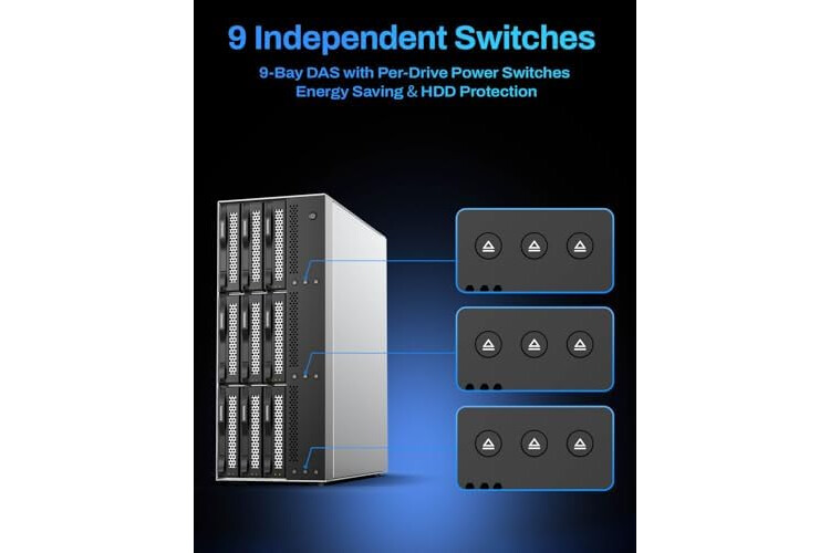 9 Independent Power Supply for 9 Drives: This D9-320 9-bay hard drive enclosure (a DAS, NOT a NAS) is equipped with 9 independent drive power switches and a master power switch, allowing users to individually power down unused drives. This feature effectively saves energy and significantly extends the lifespan of the hard drives. Its intelligent shutdown system safely parks heads to prevent data loss and avoid SMART errors from sudden power loss.