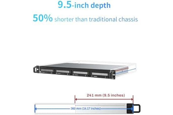 Compact Design for Seamless Deployment:The D4-320U hard drive enclosure (a DAS, NOT a NAS) redefines convenience with itsminiaturized 1U rackmount form factor. Measuring just 241mm (9.5 inches) indepth, 50% shorter than traditional chassis and weighing 3.2kg, this sleek enclosure fits effortlessly into standard server racks without the need for rails, simplifying installation. Its space-efficient design maximizes room utilization in data centers, storage closets,stairwells, or offices, making it an ideal choice for small businesses and SOHO users seeking centralized storage solutions.