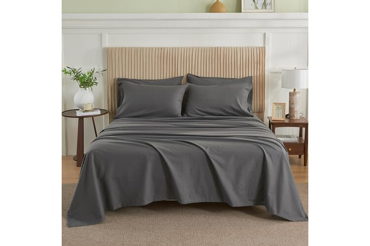 Simple&Opulence Belgian Linen Sheet Set Solid Color - 6 Pieces (1 Flat Sheet & 1 Fitted Sheet & 4 Pillowcases) 16" Deep Pocket Natural Flax Cotton Blended Soft Bedding - Dark Grey, California King