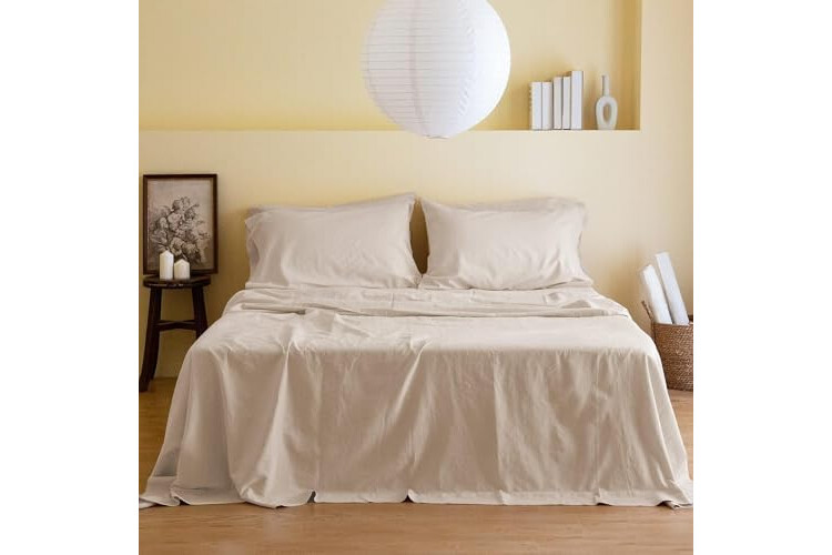 Simple&Opulence Belgian Linen Sheet Set Solid Color - 6 Pieces (1 Flat Sheet & 1 Fitted Sheet & 4 Pillowcases) 16" Deep Pocket Natural Flax Cotton Blended Soft Bedding - Linen, California King