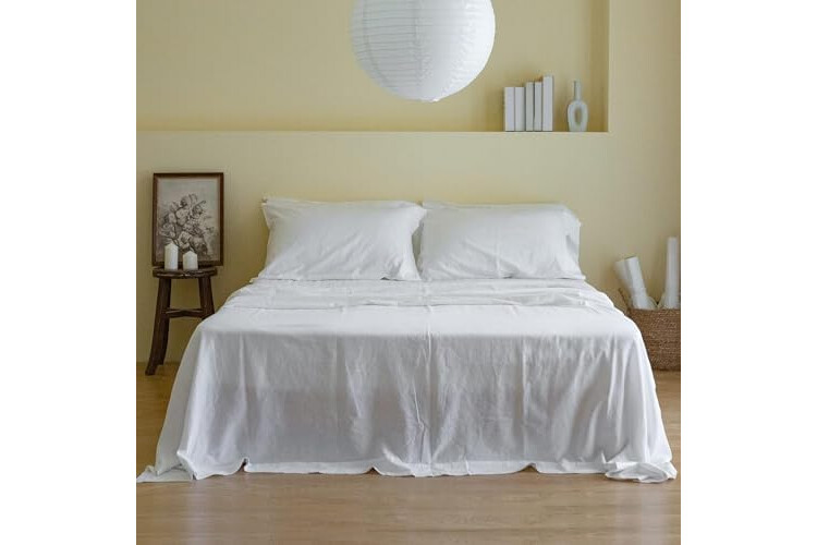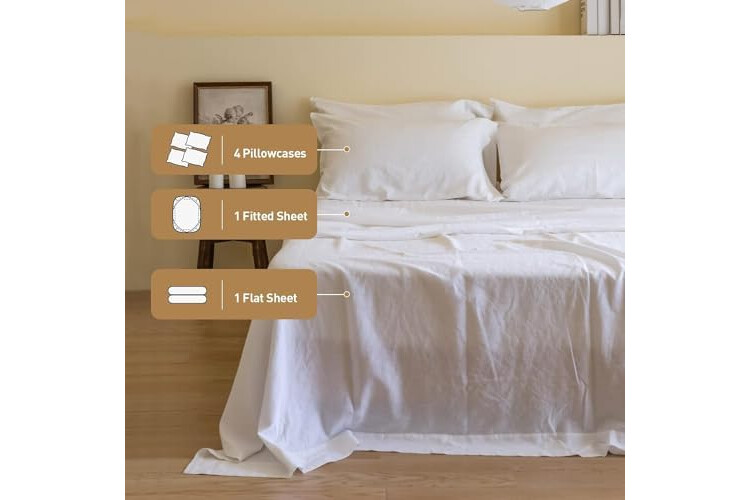 Simple&Opulence Belgian Linen Sheet Set Solid Color - 6 Pieces (1 Flat Sheet & 1 Fitted Sheet & 4 Pillowcases) 16" Deep Pocket Natural Flax Cotton Blended Soft Bedding - White, California King