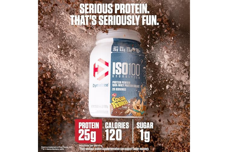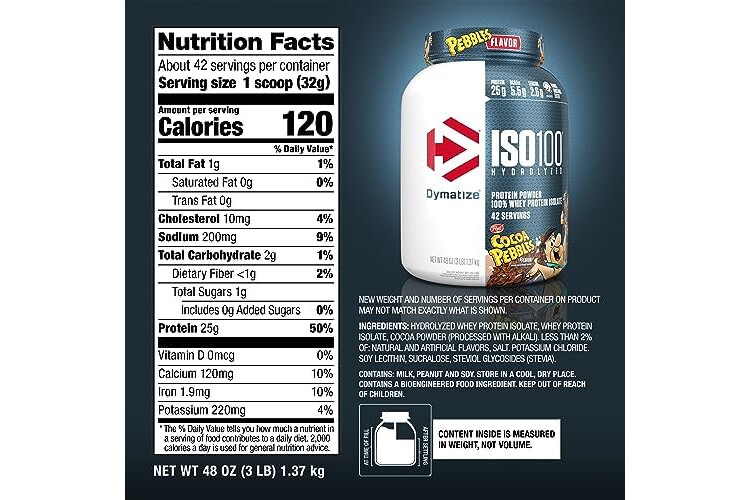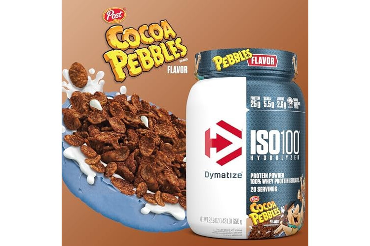 Dymatize x Cocoa Pebbles ISO100 Whey Protein Powder Isolate, 25g of Protein, 5.5g BCAAs, 120 Cal., Gluten Free, 1g Fat, 1g Sugar, 2g Carb (42 Servings)