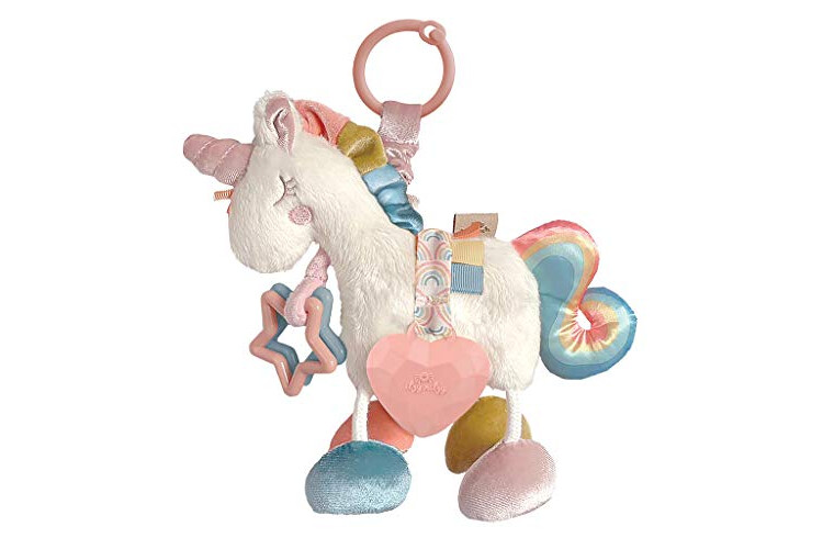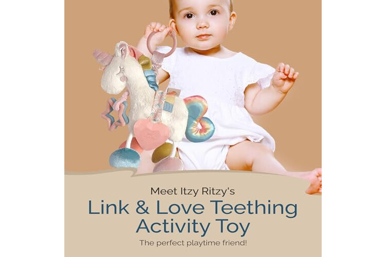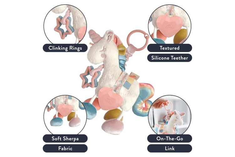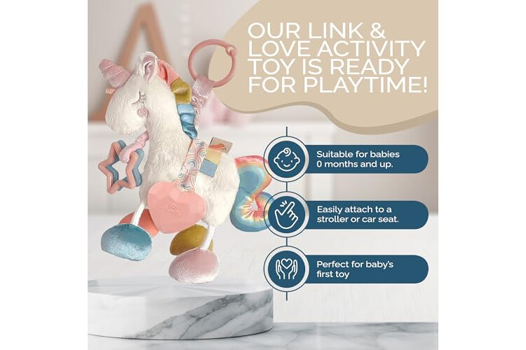 Snuggle, giggle, and discover with our Link & Love! The perfect companion for your little one's playtime adventures, it's packed with jingle sounds, crinkly features, and delightful textures. Our unicorn Link & Love boasts soft minky fabric with plush velvet and satin accents, ensuring sensory joy with every touch. Featuring textured ribbons and clinking rings, it's a sensory feast for curious minds. Your baby will delight in the gentle jingle and crinkle sounds, while the textured silicone teether provides soothing relief for teething discomfort. With its playful dangling legs and convenient on-the-go link, it's the ideal stroller and car seat toy for babies 0 months and up, making it a thoughtful baby gift from Itzy Ritzy.