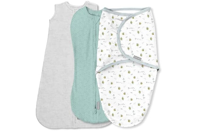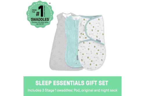 SwaddleMe by Ingenuity Comfort Pack Baby Swaddle Set, Size 0-3 Months, 5-14 Pounds, SwaddleMe Pod, Original Swaddle, Night Sack, 3pk - Little Bees