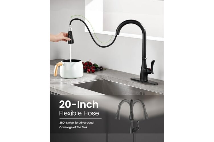 Reach Area: Clean every inch with ease! Our 20-inch pull-down hose effortlessly reaches sink corners and countertops. Combined with 360° rotation, it provides perfect coverage for single or double sinks