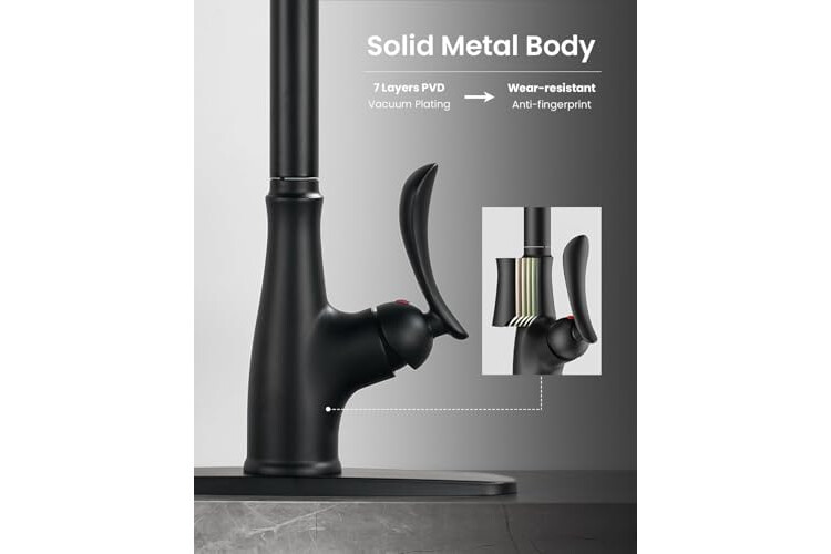 Premium Durability & Healthy Water: Kitchen sink faucet is crafted with a 7-layer PVD finish (resisting rust, corrosion, stains, and fingerprints). Features a drip-free premium ceramic cartridge (tested 550,000+ cycles) and a water-saving aerator (1.8 GPM)