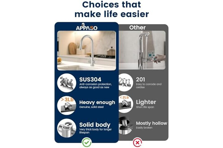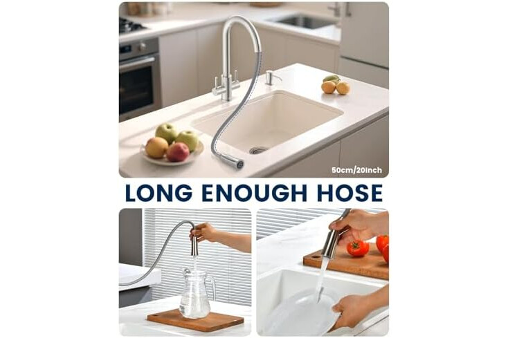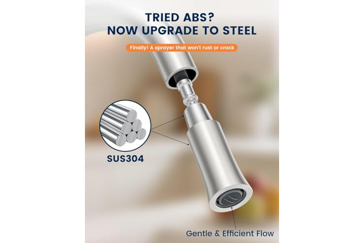 Market-First Stainless Steel Sprayhead: Our 2 handles sink faucet features a premium stainless steel pull-out spray head, offering unmatched durability and resistance to rust, tarnish, and hard water buildup—unlike common plastic alternatives