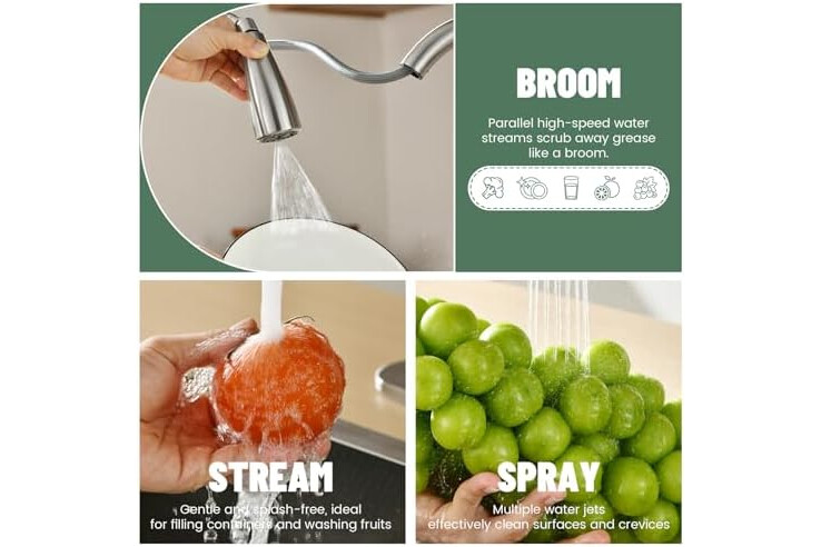 [Professional Triple-Function Nozzle] Equipped with a 3-mode spray head (Stream, Shower, Spray) to handle any task. Get a powerful spray for cleaning, a steady aerated stream for filling, and a wide-ring shower mode for rinsing produce
