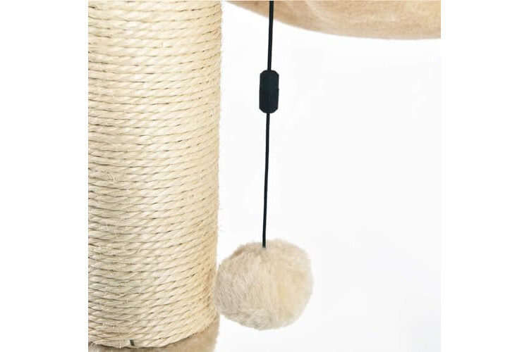 2 sturdy scratching posts, plush suspended hammock, secure base, and a replaceable dangling soft ball toy