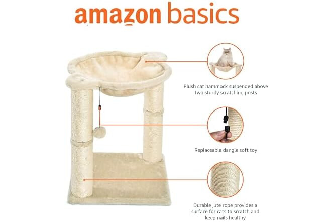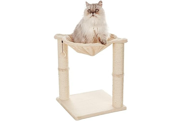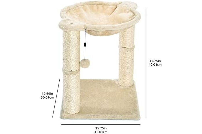 Amazon Basics Cat Condo Tower with Hammock Bed and Scratching Post,Easy to Assemble,Plush Hammock,Interactive Hanging Ball,Durable Sisal Scratch Posts for Indoor Cats, 15.8 x 15.8 x 19.7 Inches, Beige