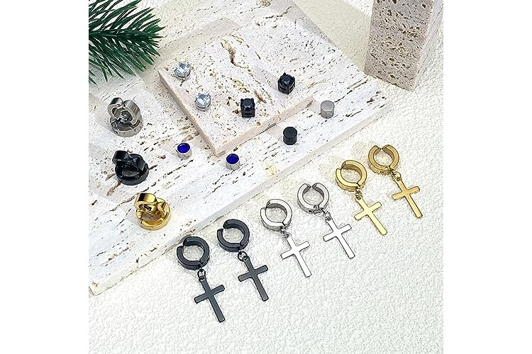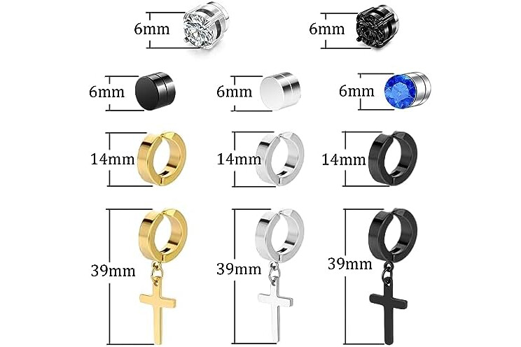 Magnetic Earrings - 15 Pairs Clip On, Non-Pierced, Fake Earrings - Black Cross Hoop Dangle for Men & Women