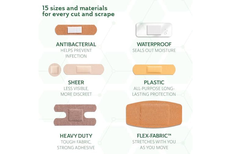 FIRST-AID KIT ESSENTIALS: This assortment of Antibacterial (30), Waterproof (30), Sheer (80), Plastic (60), Heavy Duty (30) and Flex Fabric (70) bandages caters to various needs, from discreet protection to extra-strong durability and comfort