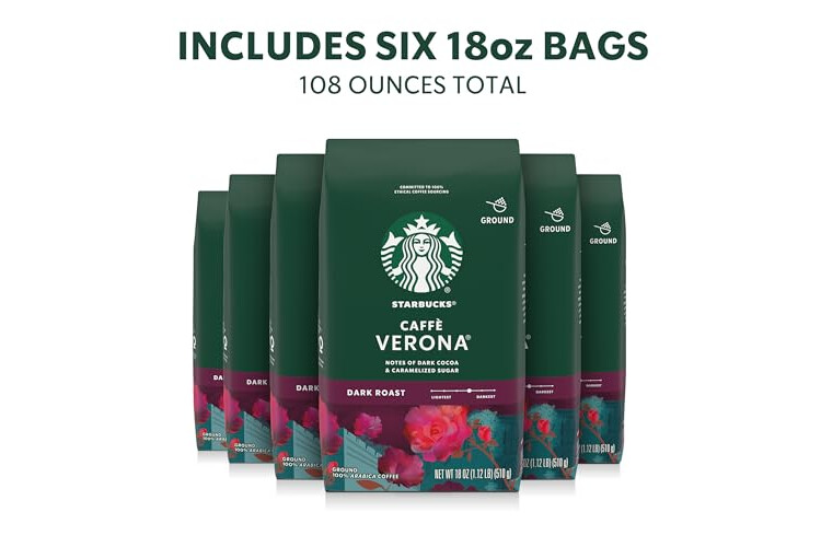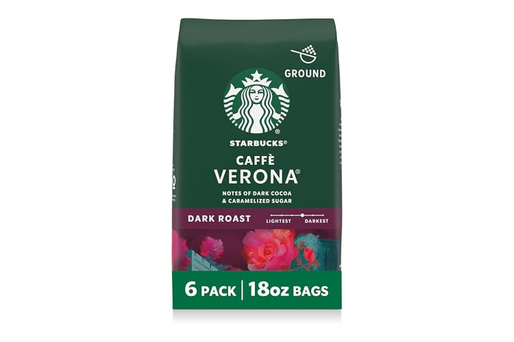 PREMIUM GROUND COFFEE: Enjoy the Starbucks coffee you love at home with six 12-ounce bags of Starbucks Caffè Verona dark roast ground coffee