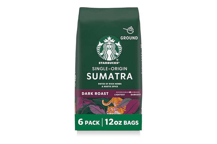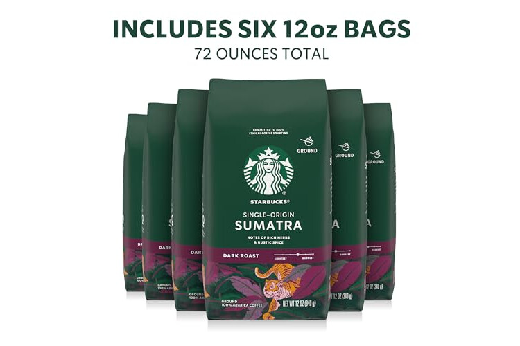 PREMIUM GROUND COFFEE: Enjoy the Starbucks coffee you love at home with six 12-ounce bags of Starbucks Single-Origin Sumatra dark roast ground coffee