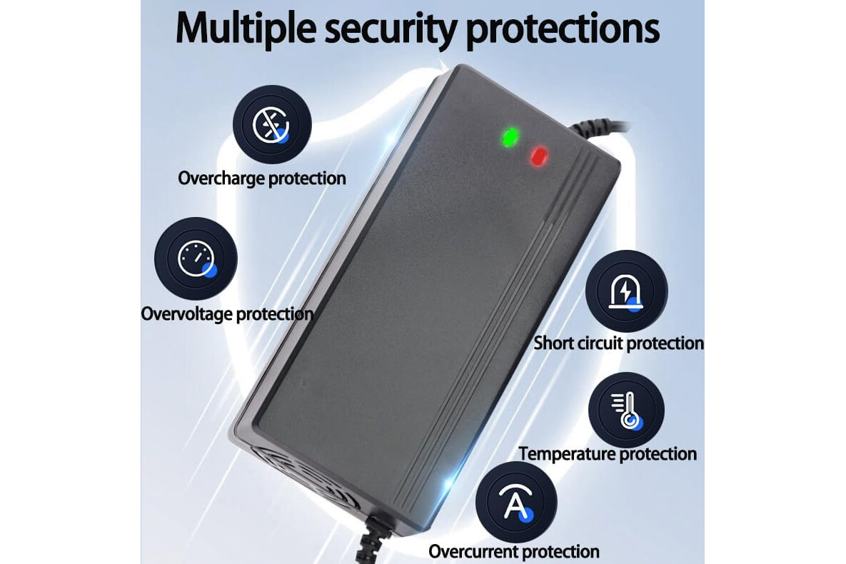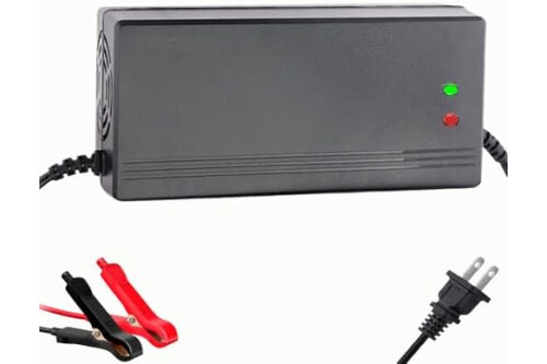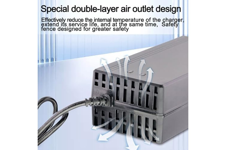 LED Indicator and Durable Shell--The battery charger with two LED indicator is easier to monitor the battery charging status(---Power indicator light :Red light;----Charging :Red light,Full:Green light).The sturdy shell can effectively protect the charger, the flame-retardant material effectively protects safety, and the powerful cooling fan effectively reduces the temperature inside the charger