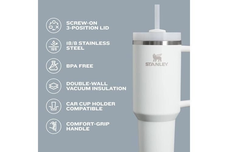 ADVANCED LID CONSTRUCTION: Whether you prefer small sips or maximum thirst quenching, Stanley has developed an advanced FlowState lid, featuring a rotating cover with three positions: a straw opening designed to resist splashes with a seal that holds the reusable straw in place, a drink opening, and a full-cover top for added leak resistance. We’ve also included an ergonomic, comfort-grip handle, so you can easily carry your ice-cold water to work, meetings, the gym or trips out of town.