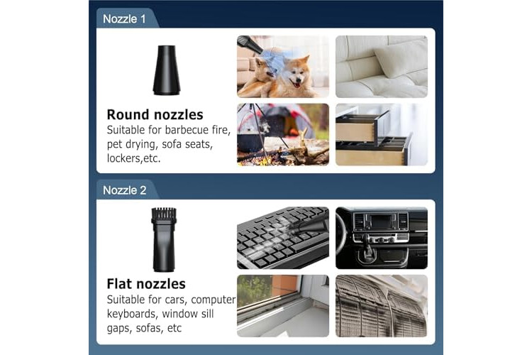 【Compressed air Duster】This air duster devices remover adopts the newest powerful motor technology which with speed of 150000RPM, maximum blowing force of 150G without a nozzle;with a nozzle, the blowing force about 130G. The powerful wind force can clean up dust devices easily.