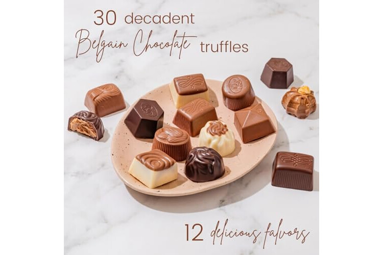 Belgian Chocolate Truffle Box with 32 Rich Chocolate Truffles- Includes silky smooth truffles in decadent varieties like mocha, raspberry, coconut, caramel, and more. Each piece individually wrapped for freshness.