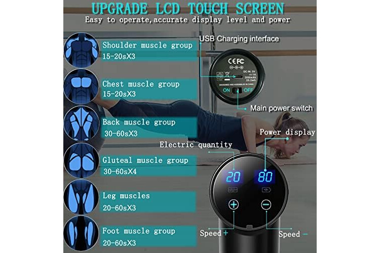 [20 levels of touch LCD touch screen] The frequency can be adjusted according to the different parts of the massage. The high-power motor will bring 1200-3200 strikes per minute. The user can change the speed of the massage gun as needed to provide a relaxing massage for each muscle.