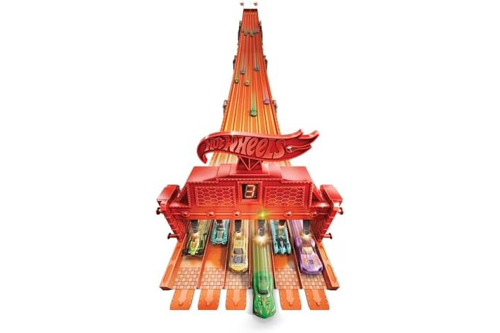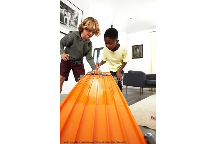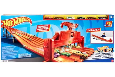 Get ready for the ultimate Hot Wheels experience with the Hot Wheels Super 6-Lane Raceway! With more than 8 feet of racing action, kids will love sending different cars down the long stretch to see which one is the fastest. The set includes six cars, so they can race down all six lanes of track right out of the box! Lights and sounds add thrilling realism – when the race is over, the winner is announced and the crowd roars with applause. Let the races begin! Not for use with some Hot Wheels vehicles. Colors and decorations may vary.