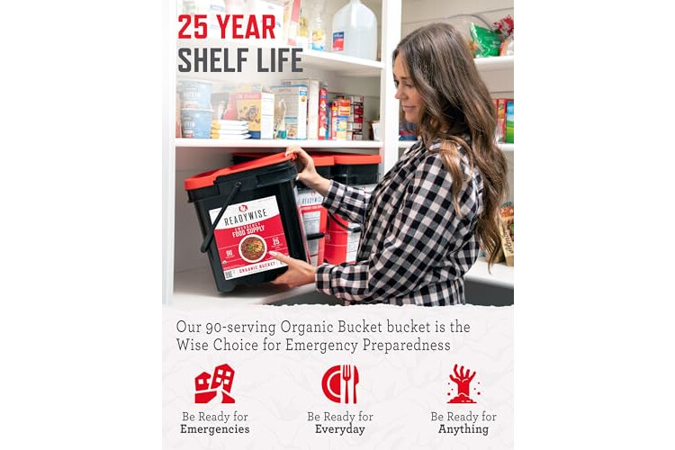 ReadyWise Emergency Food Supply - 90 Servings Organic Bucket, Protein Meals, Dehydrated & Freeze Dried Survival Food for Backpacking, Camping Essentials & Prepping Supplies, up to 25 Year Shelf Life