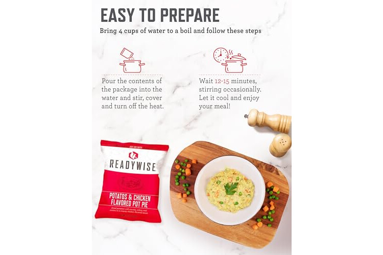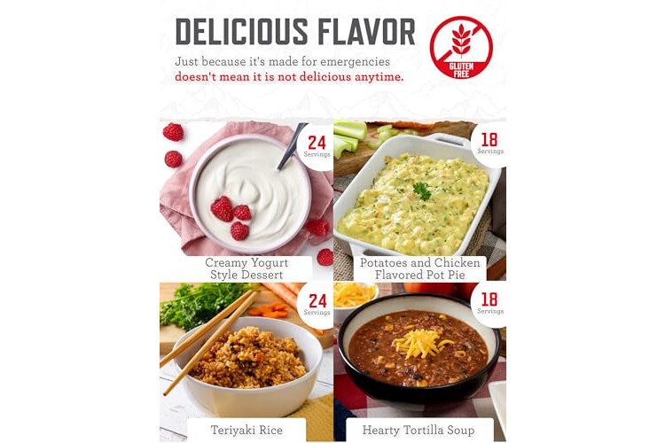 PREPPER MEALS: Our survival kit offers tasty & nutrient rich options, including freeze dried Potatoes and Chicken Flavored Pot Pie, Hearty Tortilla Soup, Teriyaki Rice, & Creamy Yogurt Style Dessert to enhance your outdoor meals reliably.